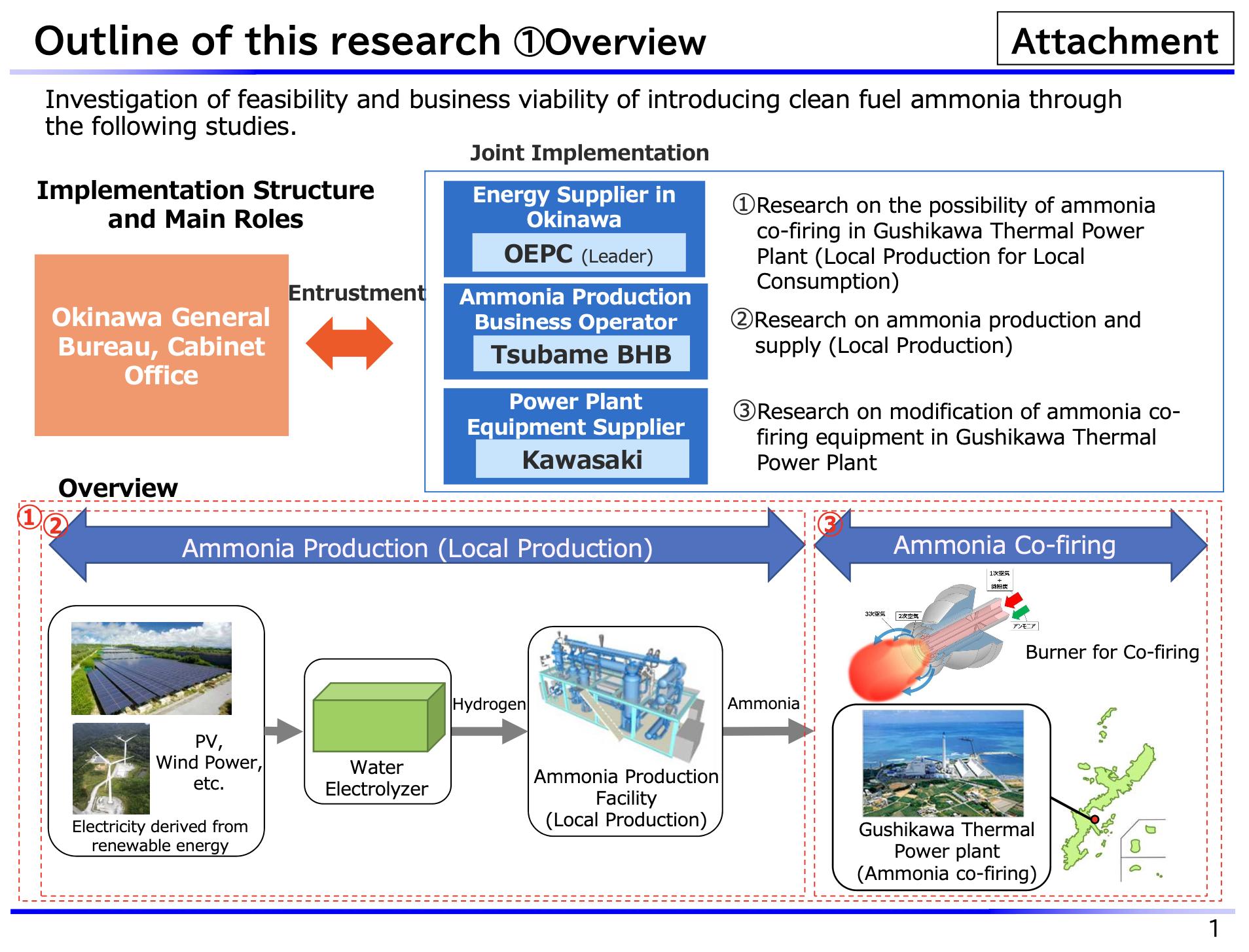 The Okinawa Electric Power Company, Incorporated (OEPC), Tsubame BHB Co., Ltd. (Tsubame BHB), and Kawasaki Heavy Industries, Ltd. (Kawasaki) jointly applied for the FY2022 Okinawa Clean Energy Introduction Promotion Research Program, which was publicly solicited by Okinawa General Bureau, Cabinet Office of Japan, and our proposal, “Research Program on Onsite Production for Local Consumption of Clean Fuel Ammonia in Okinawa,” was accepted.