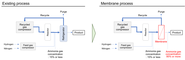 The ammonia synthesis reaction is an equilibrium reaction, and exhaust gases from the reactors contain large quantities of unreacted nitrogen and hydrogen, making it necessary to recycle large volumes of unreacted gases. To separate ammonia from mixed gases, in existing processes, the mixed gases are cooled using refrigerators to concentrate and separate the ammonia. By separating ammonia from the mixed gases using a membrane, it is possible to separate high concentration ammonia. In the membrane process, refrigerators are not required, so power consumption can be reduced.